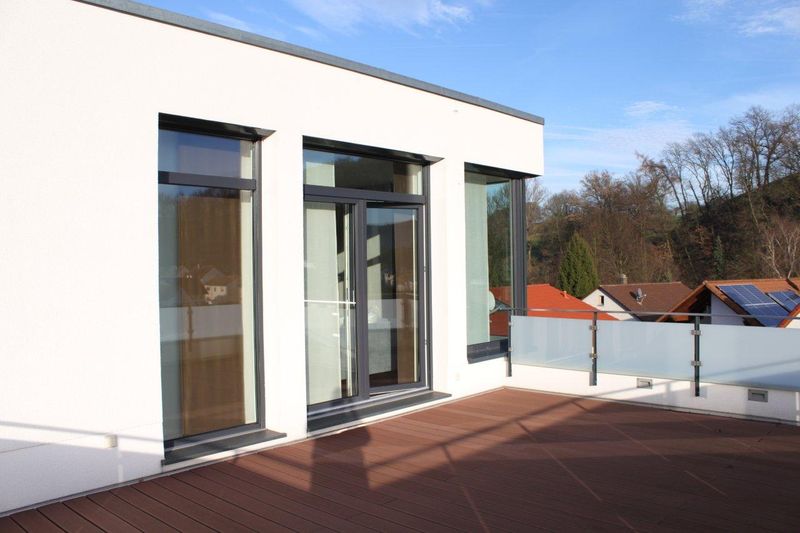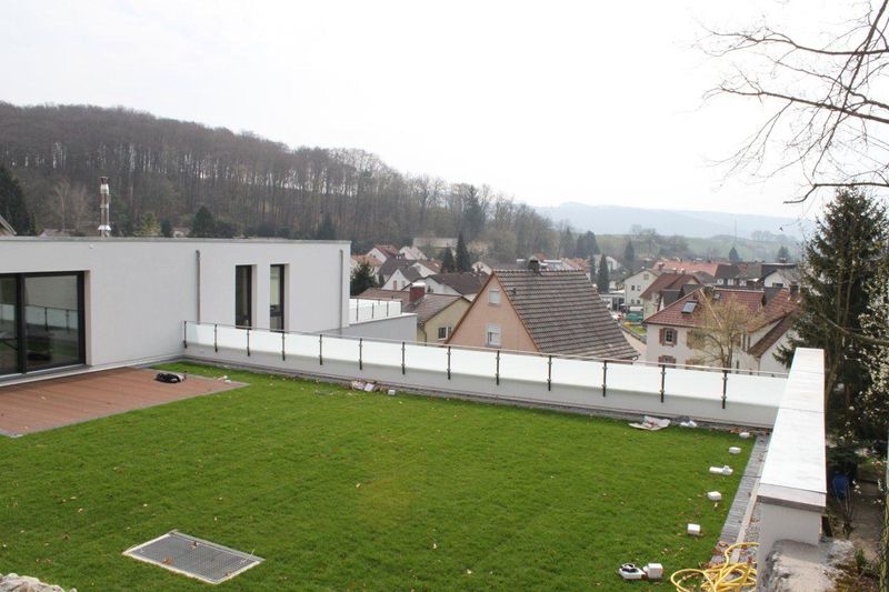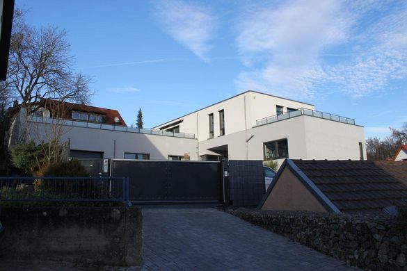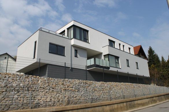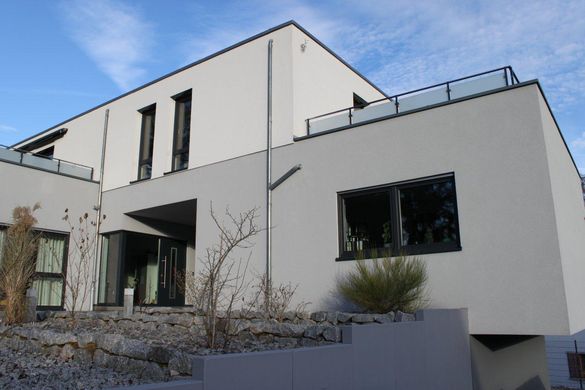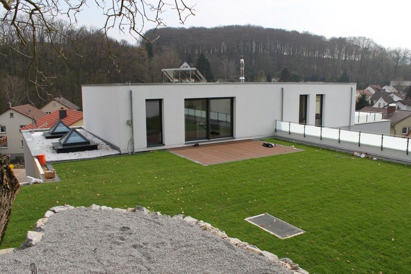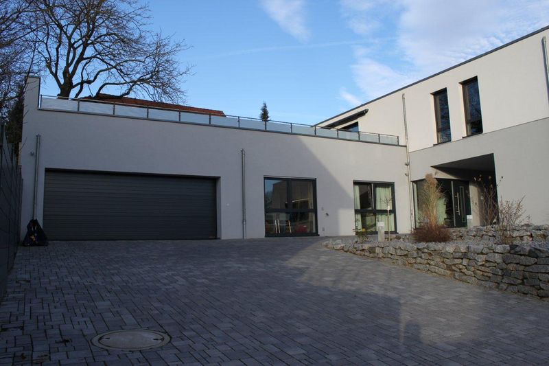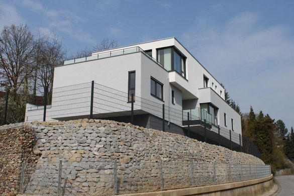 Realisierung eines gemischt genutzten Gebäudes (Wohnen, Büro) auf einem sehr schwierig zu bebauenden Grundstück in Hanglage. Durch die Anordnung des Gartens auf dem Dach eines der beiden Gebäudeflügel, ist es gelungen das Grundstück optimal, auch in Hinsicht auf die Himmelsrichtungen auszunutzen. Hier zeigt sich das die Planung der Außenräume eng mit der Gebäudeplanung verbunden ist. Diese Leistung wurde ebenfalls durch unser Büro erbracht.