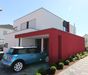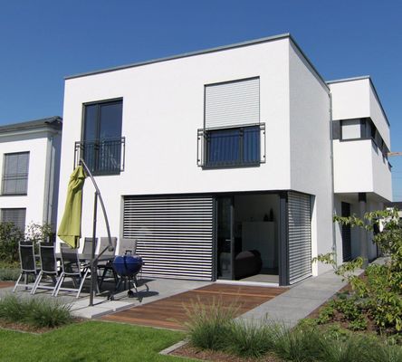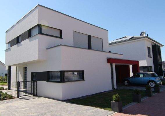 Modernes Wohnhaus aus kubischen Formen bestehend.