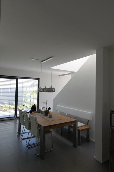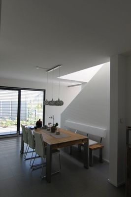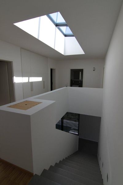 Durch seine Vor- und Rücksprünge strahlt es trotz geradliniger Linienführung eine gewisse Lebendigkeit aus. Die Herausforderung bei diesem Entwurf bestand darin, das vorgegebene Raumprogramm trotz einer sehr geringen Grundstücksbreite und sehr engen baurechtlichen Vorgaben umzusetzen.